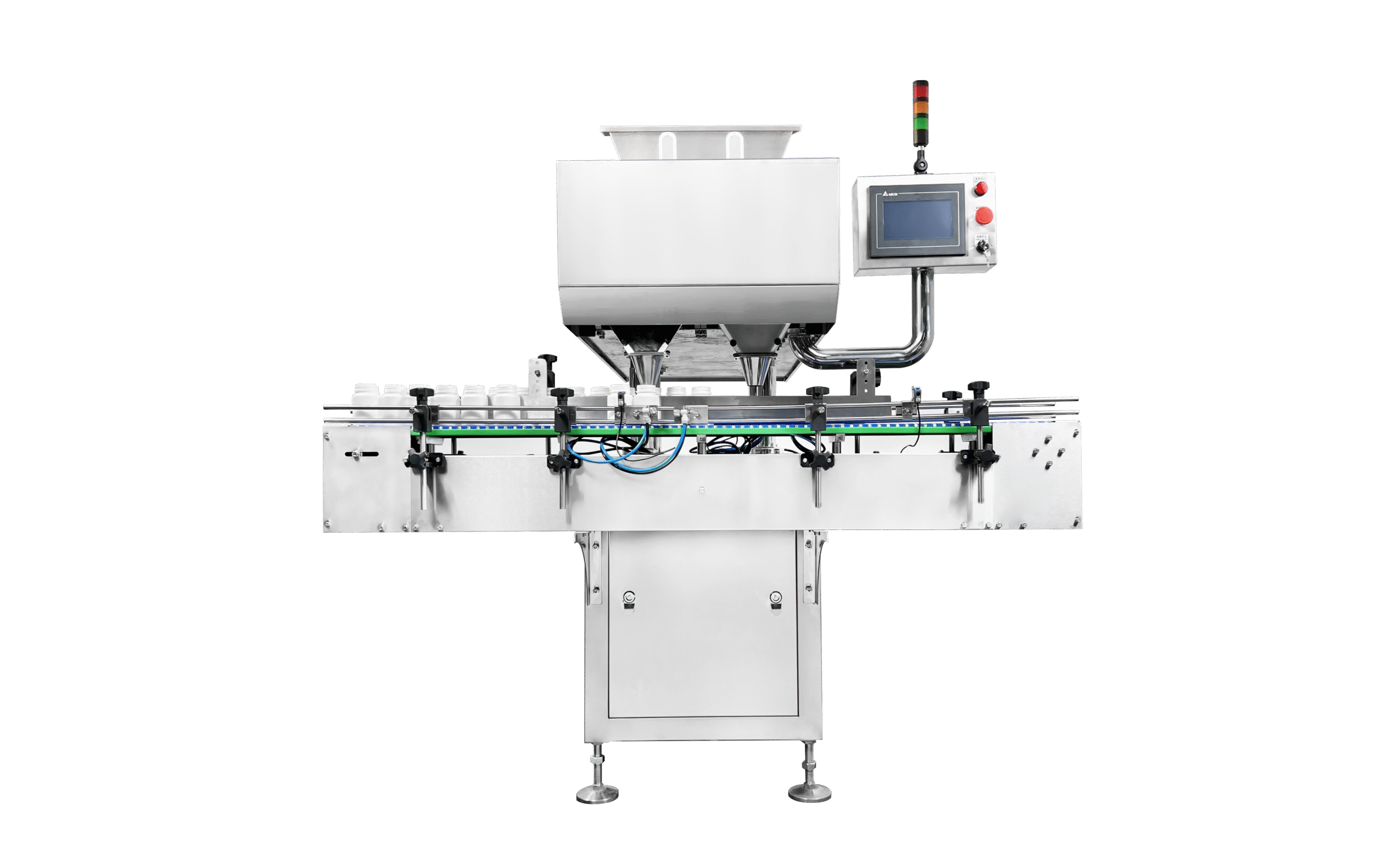 Economy series pill counter machine for counting and bottling of granular materials of various sizes and shapes.